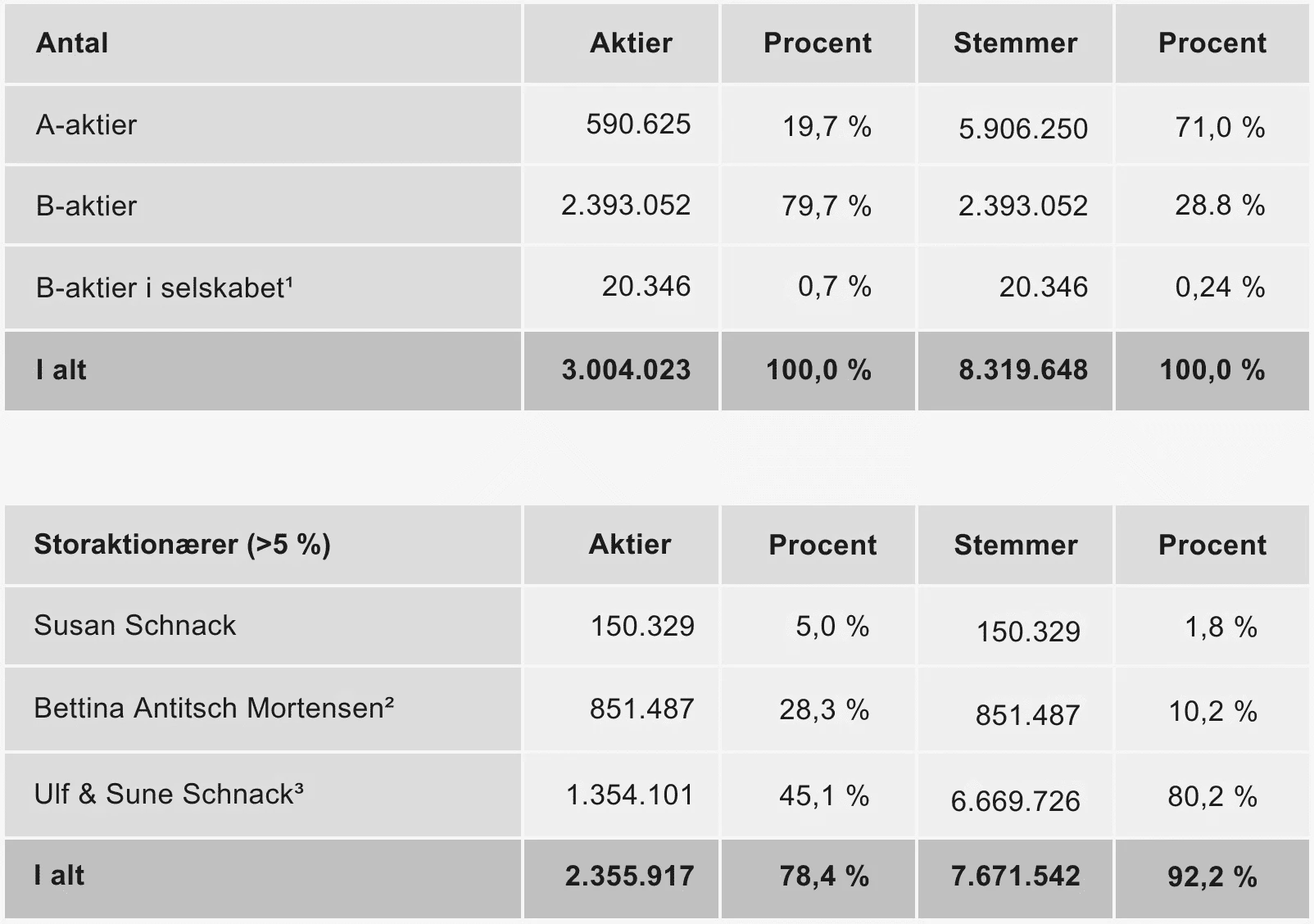 Ultimo regnskabsåret 2024/2025 var der registreret 1.759 aktionærer i selskabets ejerbog. Selskabets beholdning af egne aktier udgjorde 0,7 % af aktiekapitalen. De er stemmeløse iflg. Selskabsloven og værdisat til 0 DKK.