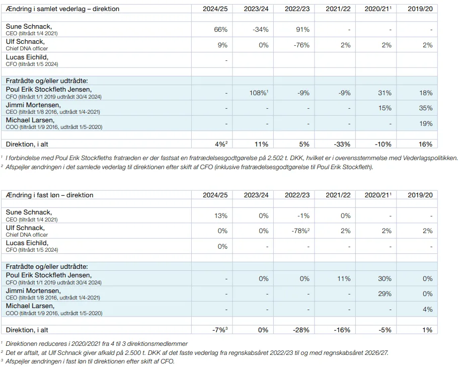 For CEO, Sune Schnack, vil værdien af RSU-programmet kombineret med de tildelte tegningsoptioner overstige Vederlagspolitikkens grænse på 50% af det årlige faste vederlag (inkl. pension og angivne goder) på tildelingstidspunktet. Overskridelsen vil dog kun udgøre 4,19%-point, svarende til i alt 54,19% af det årlige faste vederlag (inkl. pension og angivne goder). I henhold til Vederlagspolitikkens afsnit 4 kan bestyrelsen træffe beslutning om midlertidigt at fravige principperne i vederlagspolitikken, såfremt det vurderes nødvendigt for at sikre selskabets langsigtede interesser og bæredygtighed. Henset til, at (a) de udstedte tegningsoptioner alene udgjorde en erstatning af et tidligere optionsprogram uden forøgelse af den tildelte mængde optioner, jf. ovenfor, (b) der alene var tale om en mindre overskridelse, (c) formalisering af tidligere tegningsoptioner var nødvendig for at bringe disse i overensstemmelse med den opdaterede Vederlagspolitik, og (d) tildelingerne ansås nødvendige som en del af et fastholdelsesprogram for at sikre den langsigtede værdiskabelse, godkendte bestyrelsen denne konkrete mindre fravigelse af Vederlagspolitikken, tillige med tilbagekøb, annullering og erstatning af det tidligere optionsprogram.